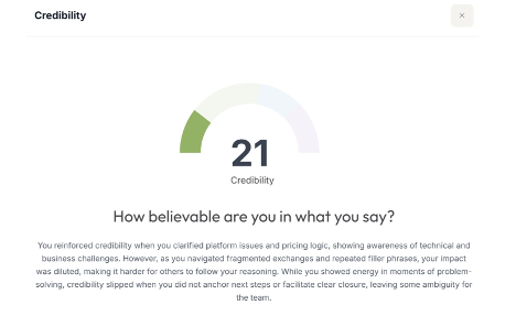 We heard one team talking about how on a call they had with another team, they both got “beat up on their credibility” score. While they were able to have a laugh about it, that knowledge was helpful to understand why. One of those users shared “Sandi told me that repeated filler phrases diluted my impact and that my "credibility slipped when you did not anchor next steps or facilitate clear closure, leaving some ambiguity for the team". With this knowledge they can know how to do better next time and get their score up.