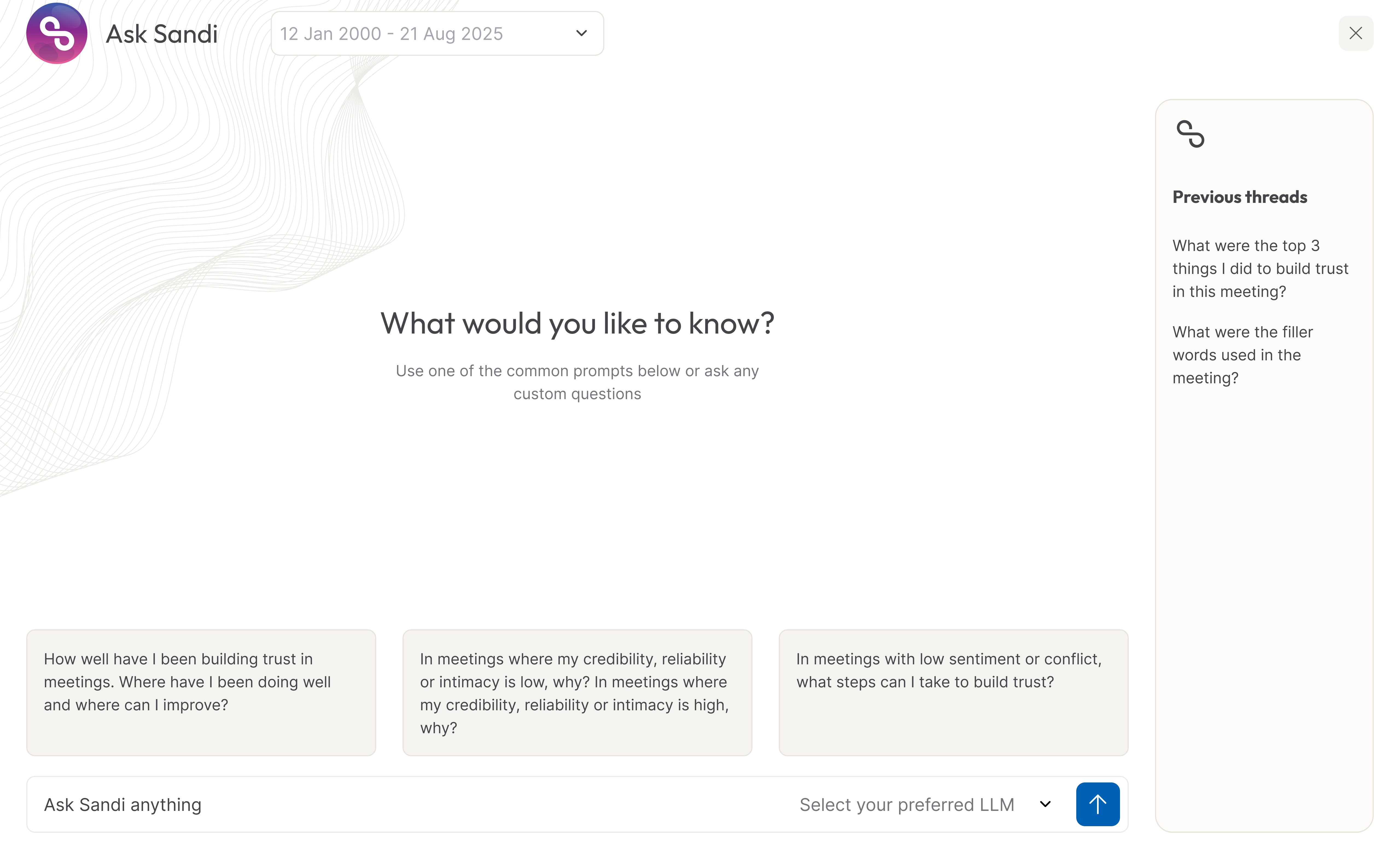 Sandi analyzes data from all your past meetings (you can break down specific periods of time or use data from all your meetings) and relates them to your questions, so feedback and coaching is tailored to you. The more meetings you have with Sandi present, the more Sandi gets to know you, and the more comprehensive the coaching becomes.