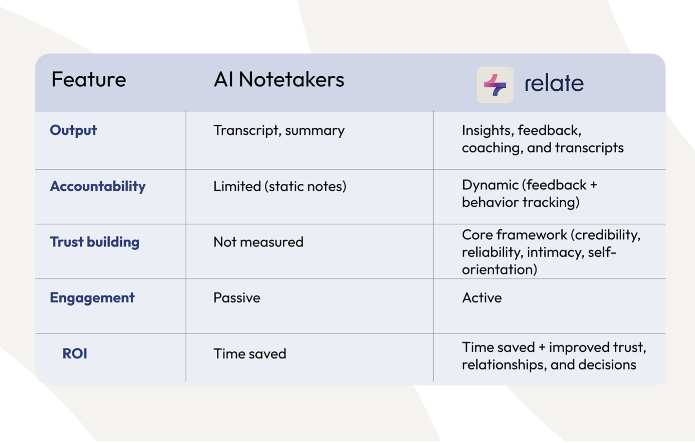 AI notetakers provide meeting summaries. Relate goes further with insights and coaching that builds trust, clarity, and accountability in every meeting.
