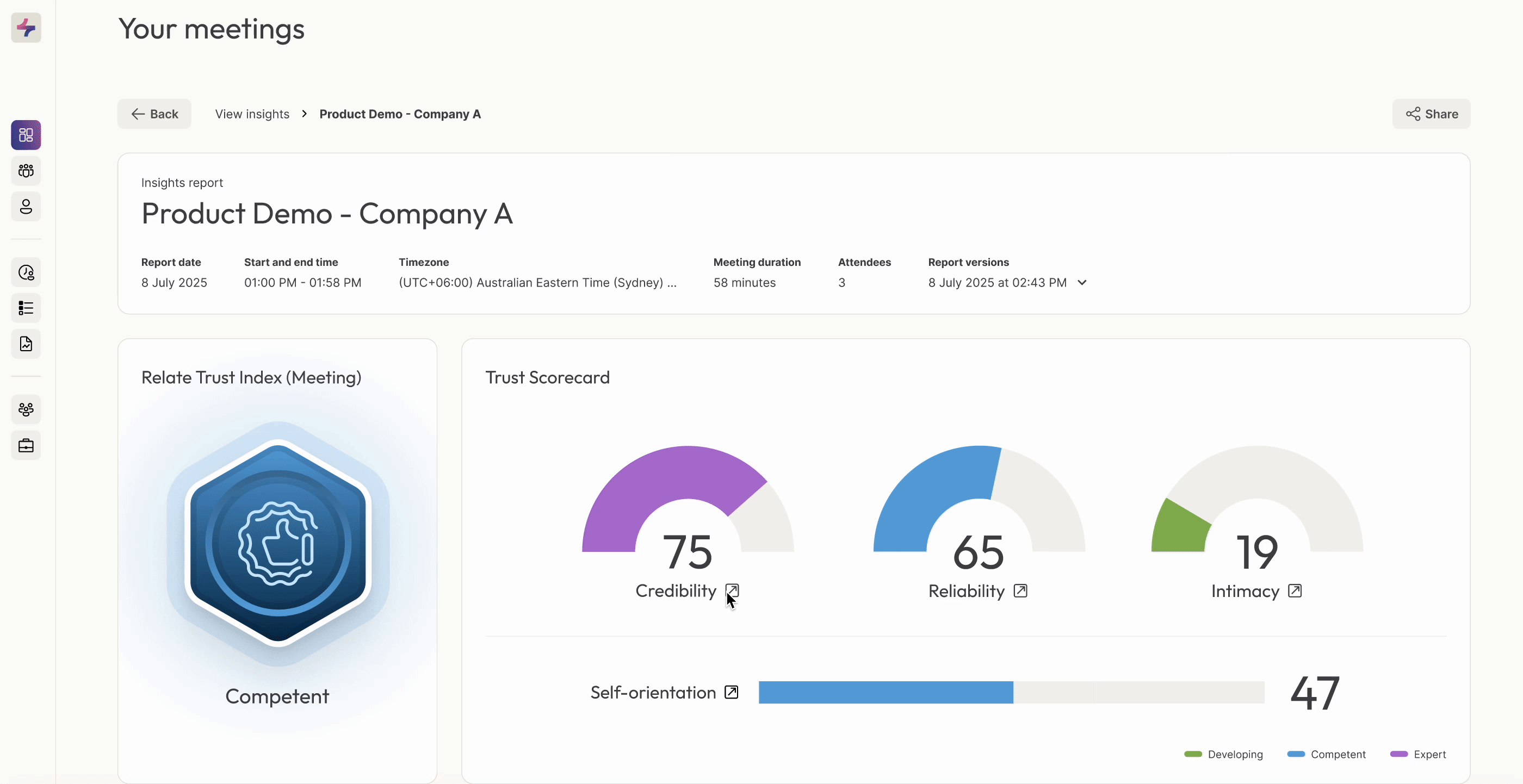 We’ve rebuilt Relate around a modular, behavior-driven design. Now, each trust factor (credibility, reliability, intimacy, and self-orientation) is evaluated independently, using dedicated prompts designed to capture the nuances of that behavior. By breaking the process into focused analyses, Relate delivers insights that are sharper, more accurate, and easier to act on.